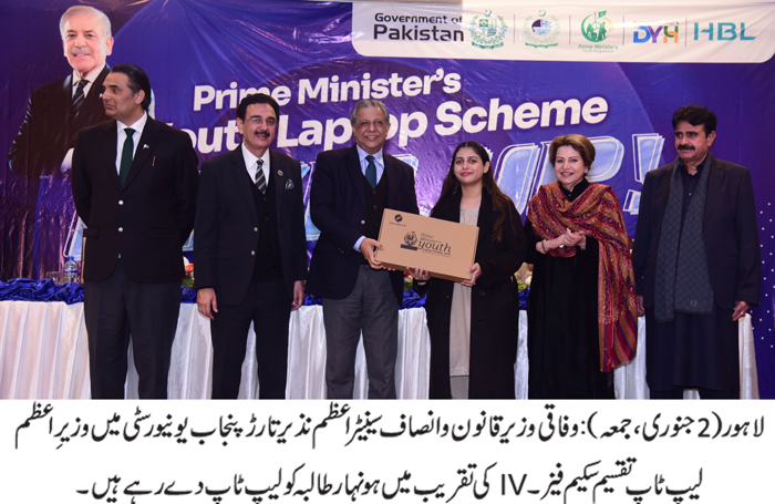 Lahore: (Friday, January 2): Federal Minister for Law and Justice, Senator Azam Nazeer Tarar, said that the youth, including male and female students, are Pakistan’s greatest and most valuable asset. He urged them to set aside hatred on social media and focus on thinking positively about Pakistan. He was addressing a ceremony of the Prime Minister’s Laptop Distribution Scheme Phase-IV at Punjab University here on Friday. On this occasion, PU VC Prof Dr Muhammad Ali, PM’s Special Assistant Talha Barki, Minister for Public Affairs Rana Mubashir Iqbal, MNA Shaista Parvez Malik, Registrar Dr Ahmed Islam, President Academic Staff Association Prof Dr Amjad Abbas Khan Magsi, representatives of the HEC, faculty members, and students were present. In his address, Azam Nazeer Tarar said that greater investment is needed to promote skill-based and need-oriented education. He said that even in the modern era there are many children who lack resources, but the government is striving to ensure that no talented student is deprived of these gadgets. He added that the scheme initiated by Prime Minister Muhammad Shehbaz Sharif during his tenure as Chief Minister has now expanded across the entire country. He said that the scheme faced significant political point-scoring and criticism, but during the COVID period many students benefited by making proper use of laptops. He emphasized that a society cannot progress without respecting teachers, adding that whatever position he has achieved today is due to PU. He said that for the country’s development and prosperity, everyone must play their role with hard work, dedication, and honesty. Vice Chancellor Prof Dr Muhammad Ali said that Prime Minister Muhammad Shahbaz Sharif launched the scheme in line with the needs of the time, and it has yielded positive results, with the constructive use of laptops transforming students’ lives. He said that women’s advancement in every field is vital for Pakistan’s development and prosperity. He added that 80 percent of individuals in the top judiciary, including Azam Nazeer Tarar, are alumni of Punjab University. He further stated that 70 percent of Lahore’s IT market is served by graduates of the Punjab University College of Information Technology. He said that the university is taking steps to familiarize its students with modern technology and that providing a peaceful environment to students is a top priority. On behalf of the Punjab University community, he thanked Prime Minister Muhammad Shahbaz Sharif. Under this scheme, 3,140 talented students of Punjab University will receive laptops.